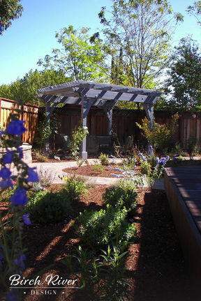 The client of this sunny back yard requested relaxation areas and protection from the hot summer sun. To address the needed sun protection, two new pergolas were custom-designed by Birch River Design and painted blue – the client’s favorite color. Meandering paver pathways, a retaining wall, and a low-water plant palette were also added. LED lighting for night-time entertaining and safety were the perfect finishing touches for this back yard retreat.